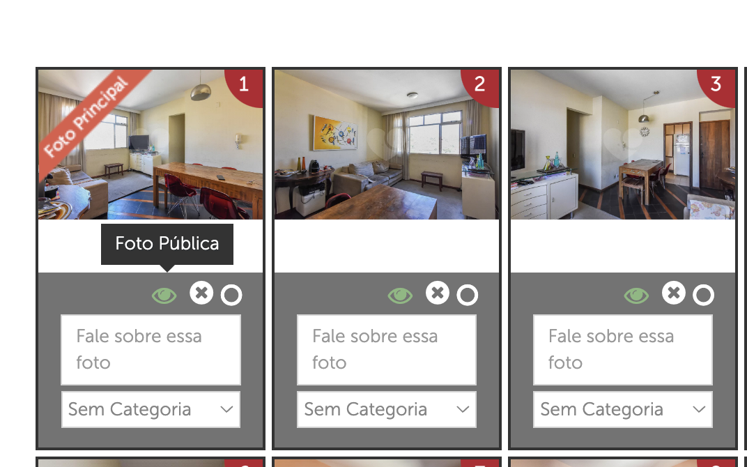 Para que as imagens sejam exibidas no site da Lopes, é essencial marcar a opção correspondente durante o processo de inserção das imagens. Ao selecionar o ícone do olho ao lado das imagens, elas serão tornadas públicas e automaticamente apresentadas no site da Lopes.