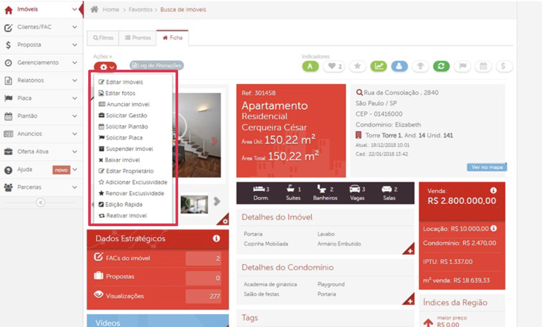 Para solicitar a baixa ou reativação de um imóvel, clique no ícone de engrenagem e selecione a opção apropriada no menu. Em seguida, siga todos os passos indicados durante o processo para completar a solicitação com sucesso.